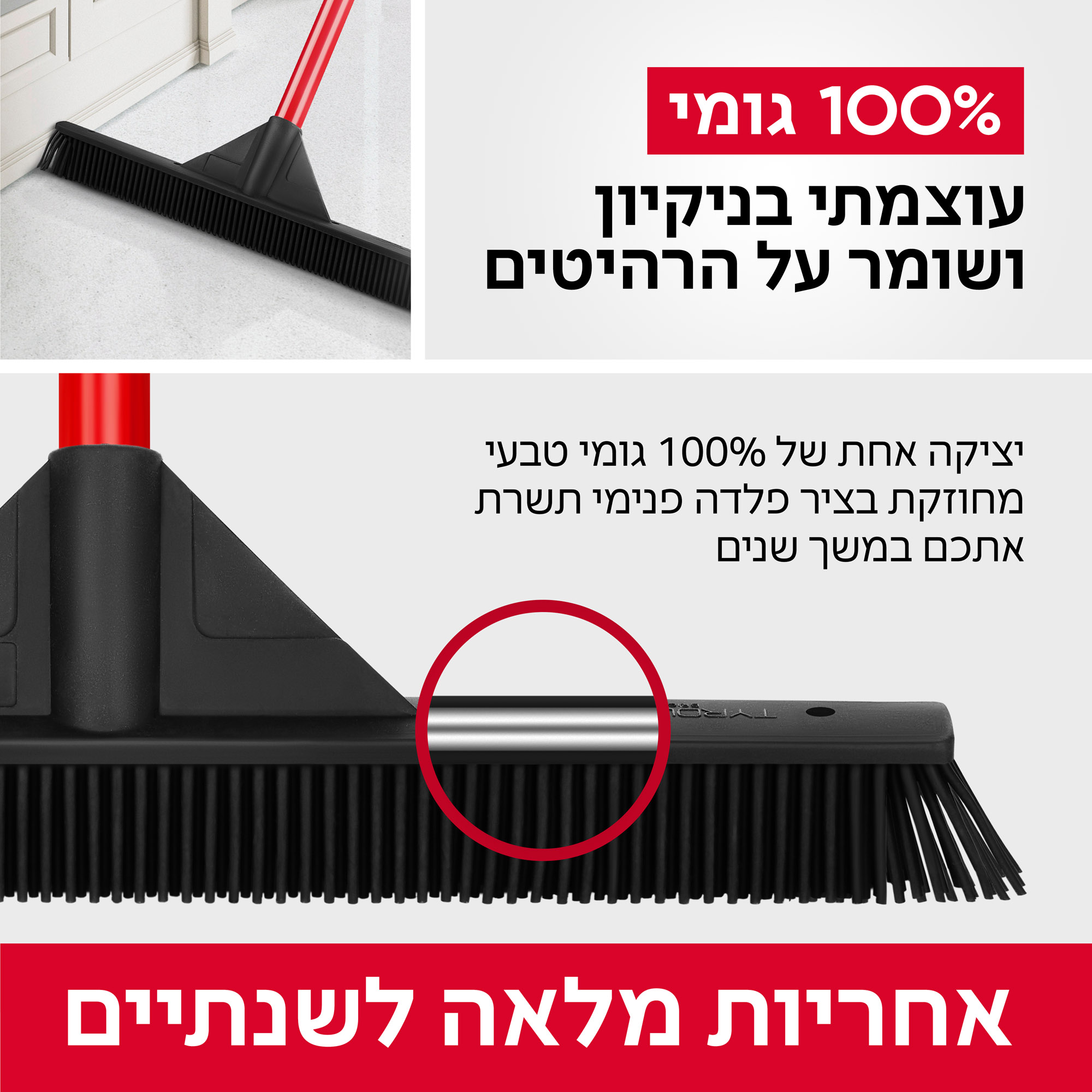 מוכן לעבודה מאומצת: יציקה אחת של 100% גומי טבעי מחוזקת מבפנים במוט פלדה מבטיחה שהמטאטא ישרת אתכם לאורך זמן (אנחנו מספקים אחריות של שנתיים). מגיע עם מקל נירוסטה טלסקופי אל-חלד, ארוך במיוחד, צבוע באפוקסי לעמידות מירבית (מתארך עד 150 ס”מ). וצביעת אפוקסי השומרת עליו בפני חלודה. ישרתו אתכם לאורך זמן, שנים של ניקיון איכותי ויעיל. לולאת תלייה בקצה הידית מאפשרת אחסון קל בסיום העבודה.